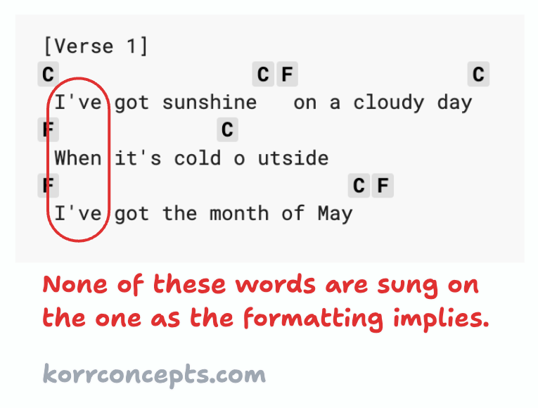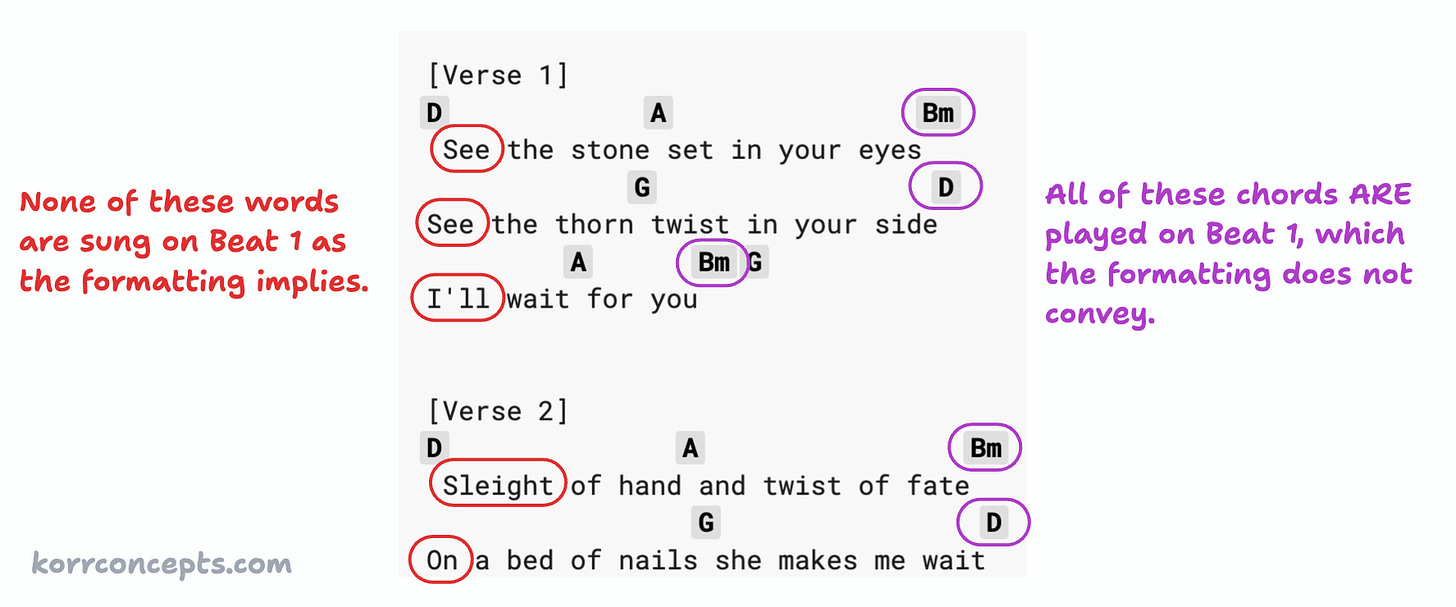 The formatting incorrectly implies that each lyrical line’s first word is sung on Beat 1, and doesn’t convey that many chords are played on Beat 1.