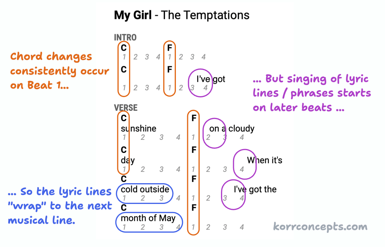 We see/hear both techniques in “My Girl.” There’s a recurring pattern where David Ruffin waits to start singing lyrical lines until later in the musical line (“I’ve got …”, “When it’s …”). This wraps the lyrical line to the next musical line, so mid-sentence words — not the sentences’ first word — are sung on beat 1 (“… sunshine”, “… cold outside”).