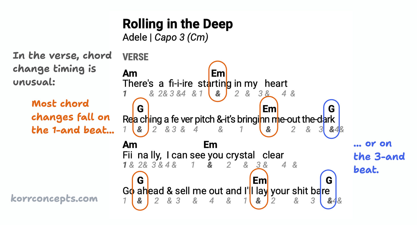 For example, the Adele hit has unusual chord-change timing: In the verses, most chord changes fall on the 1-and and 3-and beats, which always feels later than you’d expect. I’ve heard this song dozens of times, and those changes still aren’t intuitive for me.